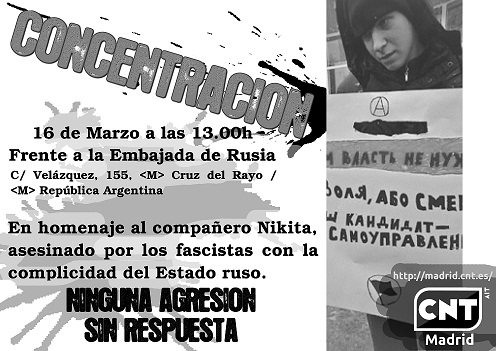 Desde CNT-AIT queremos en primer lugar mostrar la solidaridad con la madre, amigos/as y compañeros/as de Nikita. Los/as compañeros/as de la Federación Local de CNT-AIT de Madrid, presionaremos contra los intereses del Estado ruso en respuesta solidaria a su colaboración con el fascismo.