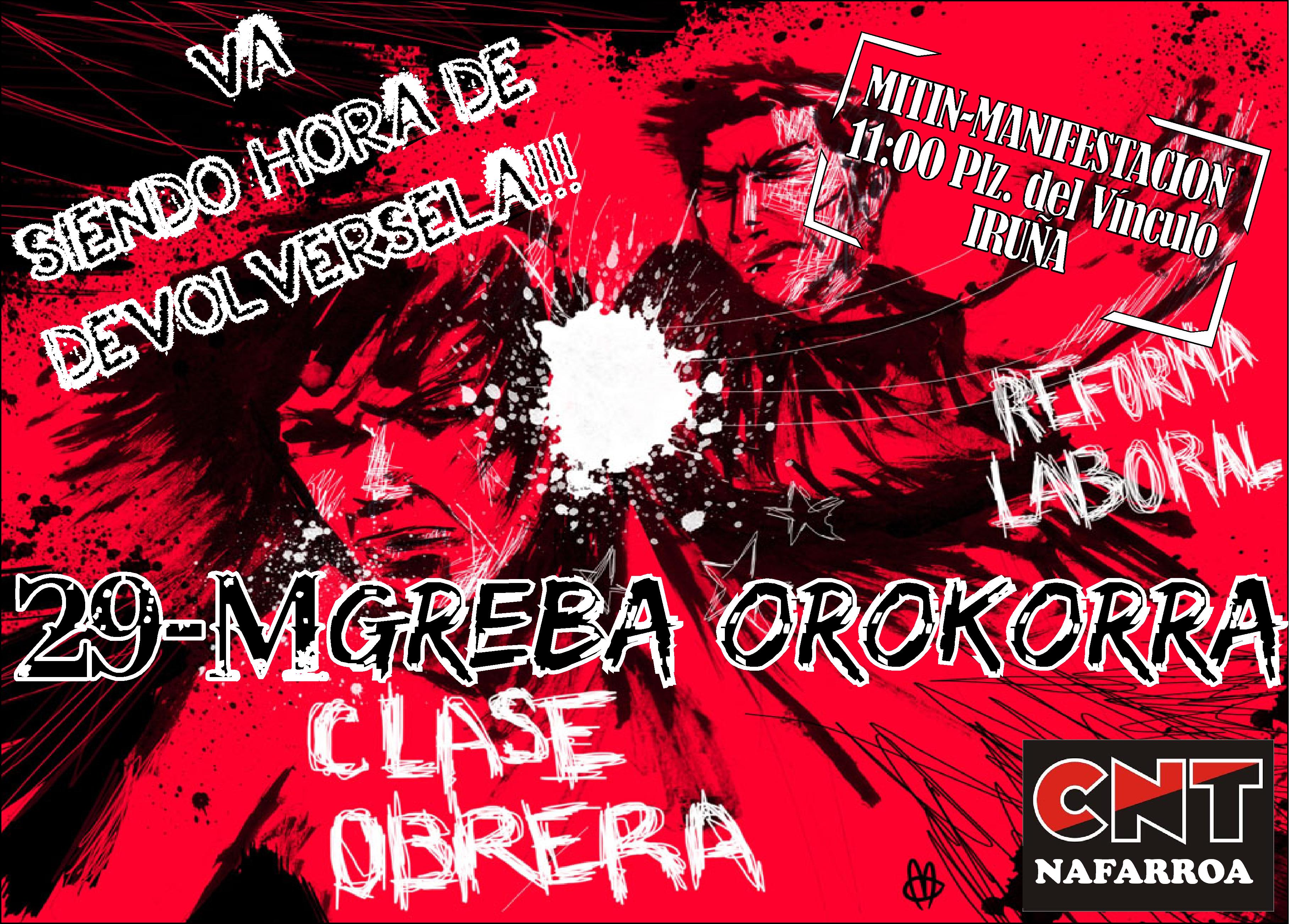 CNT anima a todas las trabajadoras de Nafarroa, a sumarse dentro de la jornada de paro de 24 este próximo 29 de Marzo, a los actos organizados por la unidad de acción compuesta por diversos agentes sociales y sindicales (CNT, CGT, 15M, Nafar libertarioak, KEM-MOC, Dale la vuelta-Bira beste aldera…).