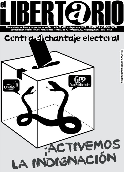 Ya en nuestra web http://www.nodo50.org/ellibertario, y dentro de pocos días en versión impresa, la edición mayo/junio 2012 del vocero anarquista venezolano. Además de nuestras secciones fijas (Editorial; Cartas; Doblepensar; La Foto; El discreto encanto de la boliburguesía; Notas Breves; Leer Libera; Comic), viene con el siguiente contenido:
