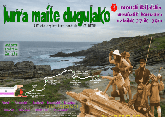 Diversos amigos y grupos de Iparralde y Hegoalde, nos hemos reunido para proclamar a los cuatro vientos que amamos la tierra. Las personas que en el día a día actuamos a favor de la tierra. Las personas que en el día a día actuamos a favor de la tierra nos unimos en esta marcha para caminar juntas. Iremos desde Urruña a Hernani del 27 al 29 de julio.