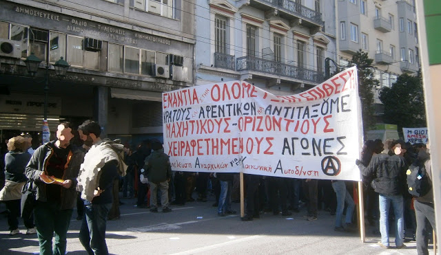 Como se citaba en un llamamiento anarquista a la huelga de hoy, no nos hacemos falsas ilusiones acerca de tales huelgas. En concreto, esta ha sido otra huelga “general” en la que no participó una gran parte de los esclavos asalariados del sector privado. Muchos trabajadores en este sector no pudieron participar temiendo la represalia de la patronal. Entre ellos los trabajadores del metro y de los autobuses de línea de Atenas, por estar todavía bajo régimen de movilización civil, desde la represión de su huelga hace algo más de un mes. También, muchos trabajadores autónomos en el sector privado no participan en las huelgas (sobre todo en “huelgas” de este tipo) por tener la convicción de que no se va a conseguir algo.