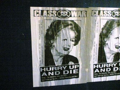 Margaret Thatcher, después de morir en el Hotel Ritz, un símbolo de la desigualdad si alguna vez hubo uno, tiene su funeral con “todos los honores militares» el 17 de abril. Si a algunas gentes les parece extraño que a otros nos alegraría bailar en la tumba de una anciana senil, es porque todavía estamos entre sus víctimas, después de todo este tiempo. ¿Significa su muerte que podemos reclamar cierto poder para hacer un cambio?. Un pequeño aumento en nuestra confianza en este momento en la lucha de clase puede ser vital. Incluso si hay algún tipo de ruptura sobre el pasado otorgándole un estridente e irrespetuoso “se acabó”, hay que sacudirse la resaca y usar estas dos o tres semanas como una oportunidad para hablar con nuestros compañeros de trabajo, amigos, familia, y todo el mundo sobre nuevos comienzos y nuevas posibilidades. Pero primero, vamos de fiesta!