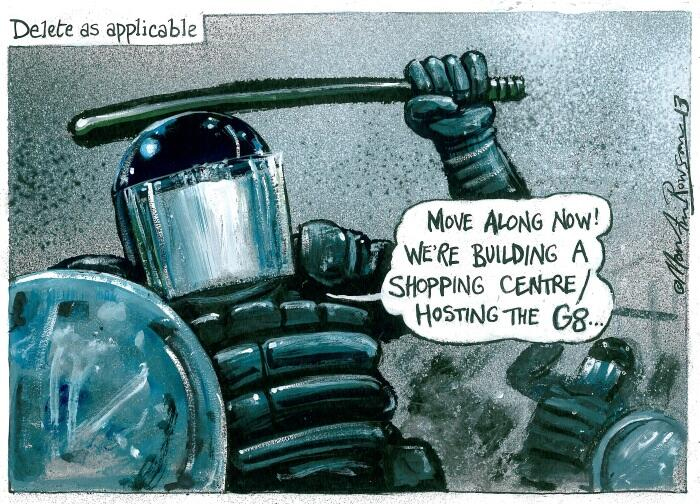 En el mundo entero, los policías hacen el mismo trabajo, protegiendo a los ladrones. En Estambul, hoy han enviado a maderos con pelotas de goma y gases lacrimógenos para desalojar el parque Gezi. En Londres, hoy vinieron con porras y tásers para limpiar el centro social de Beak Street. En Estambul, las manifestaciones continúan, mientras qu e la represión no hace más que sacar más