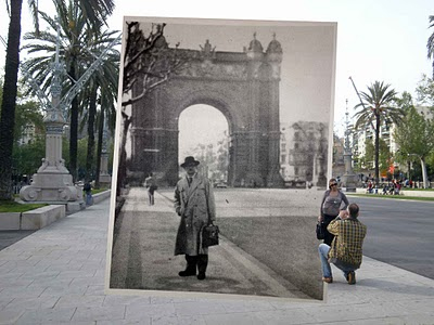 El hombre con aspecto de viajante es Quico Sabaté. A su lado y años más tarde, una pareja se hace una foto ante el mismo Arco de Triunfo de Barcelona.