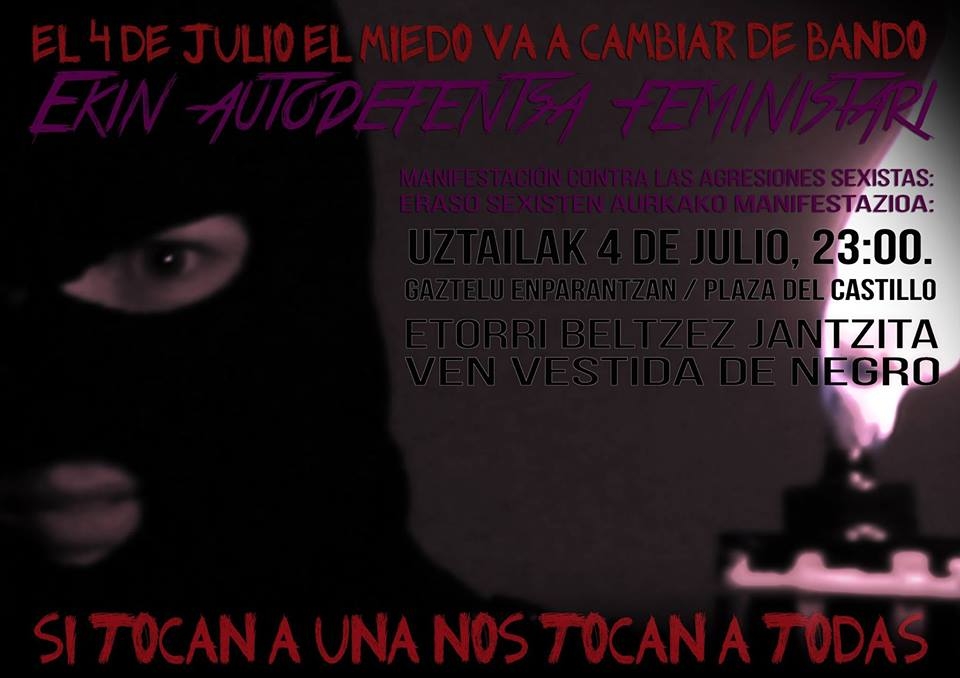 El 4 de julio, 2 dias antes del inicio de las fiestas de San Fermín, el movimiento feminista de Iruñea convoca una manifestación contra las agresiones sexistas y donde se reivindicará la autodefensa feminista. La cita es a las 23:00 desde la Plaza del Castillo.