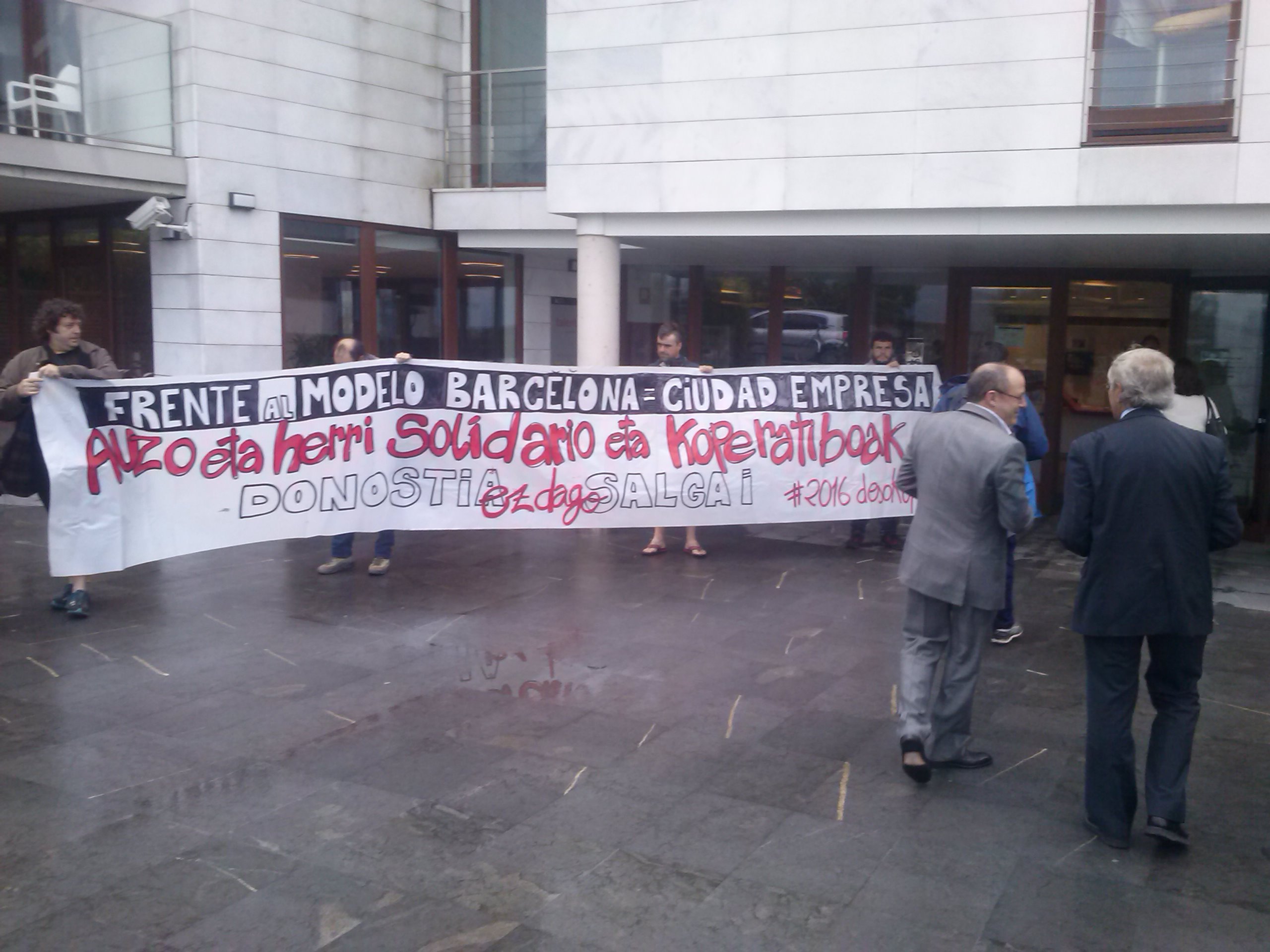 Atzo goizean protesta ekintza egin da Donostian Bartzelonako Xavier Trias alkatearen eta Juan Karlos Izagirreren aurrean, Barztelonako hiri-eredua gaiztesteko eta, «Kultur eta Berrikuntza Hirurutzak» izango direla eta «zabaltzen dituen negozio aukerak aztertzeko» asmoz Donostiako Udaleko Fomento sailak antolaltu duen bilkura instituzional-enpresariala salatzeko. Goizeko 10ak pasata, Xavier Trias eta Juan Karlos Izagirre “Talent House”era iritsi direnean hasi da protesta: 15bat lagunek pankarta zabaldu eta manifestari batek Xavier Trias eta lzagirreri protestaren arrazoia azaltzen duen orria eta Bartzelonan berriki udalak suntsitu duen Can Vies zentro sozialeko kide batek Bartzelonako hiri eredu “depredatzailea”rekiko kritika zorrotza egiten duen artikulu bat entregatu die. Pankartak gure akdarrikapenak laburbiltduz, honakoa zioen: “MODELO BARCELONA=»CIUDAD EMPRESA CONTRA LA CIUDAD SOCIAL» / HERRIAK ETA AUZOAK BIZIRIK! / DONOSTIA EZ DAGO SALGAI»/2016 DESOKUPATU!” eta «CAN VIES ELKARTASUNA» . Kontzentarzioak kasik ordu betez luzatu da “Talent House”ren atarian, manifestariek megafoniak lagunduta oihu ugari egin dituztelarik: besteak beste, “MODELO BARCELONA: EZ DA GAUZA ONA!”, “MODELO BARCELONA: CIUDAD ANTI-SOCIAL”, “TRIAS KANPORA”, “DONOSTIA EZ DAGO SALGAI”, “DONOSTIA: NO CAN-VÍES MÁS!”, e.a.
