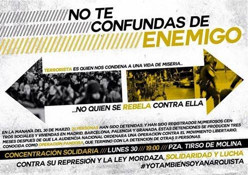 El experimento continua con el movimiento anarquista, un cáncer histórico que el Estado quiere extirpar desde tiempos de la “Mano Negra”, por ser la oposición constante a todo método de gobierno basado en la autoridad. La represión que sufre el movimiento anarquista no empieza ni mucho menos con la Operación Pandora, como enemigxs de toda autoridad se nos ha reprimido a lo largo de toda la historia durante siglos, porque defendemos la forma de sociedad más lógica, la Anarquía y eso no gusta que se difunda a quién quiere detentar el poder, jamás renunciamos a nuestro objetivo de poder vivir algún día sin gobiernos, si ahora se le llama a esto ser “terrorista”, cuando la Real Academia de la Lengua Española lo diga, seremos “terroristas” (“Terrorismo s.m. Dominación por el terror”) que la sociedad juzgue quién domina a quién y quién atemoriza a quién.