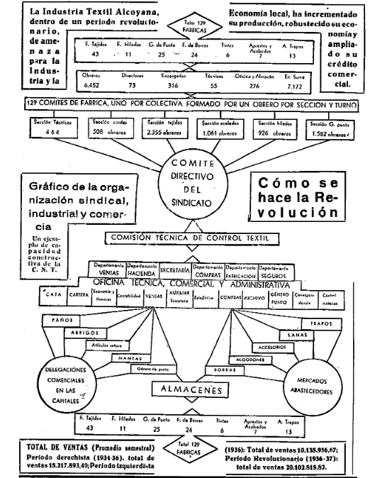 Durante la guerra civil española fue cuando se puso en práctica este modelo a gran escala. En las ciudades industriales republicanas se instauraron comités revolucionarios que en la mayoría de ocasiones fueron obra de los sindicatos. Los trabajadores, educados por la lucha de clases, ocuparon sus fábricas y talleres. Pronto se coordinaron a través de los sindicatos y establecieron una colectivización de la industria que dio pie a un control efectivo de la economía por los sindicatos.