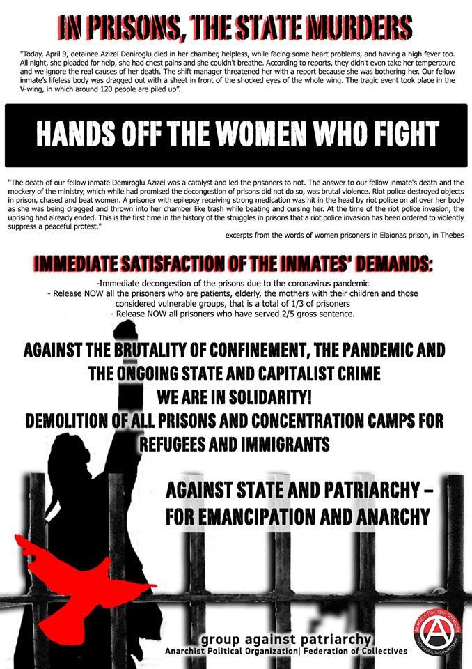 “La muerte de nuestra compañera de prisión, Demiroglu Azizel, ha sido un catalizador y ha llevado a las prisioneras a la revuelta. La respuesta a la muerte de nuestra compañera de prisión y la burla del Ministerio, que, aunque había prometido la descongestión de las cárceles, no lo ha hecho, ha sido una violencia brutal. La policía antidisturbios ha destruido objetos en prisión, perseguido y golpeado a mujeres. Una presa con epilepsia que recibía medicación fuerte ha sido golpeada en la cabeza por la policía antidisturbios en todo su cuerpo mientras la arrastraban y arrojaban a su celda como basura mientras le golpeaban y le maldecían. En el momento de la aparición de la policía antidisturbios, el levantamiento ya había terminado. Esta es la primera vez en la historia de las luchas en las cárceles que se ordena una intervención de la policía antidisturbios para reprimir violentamente una protesta pacífica.»