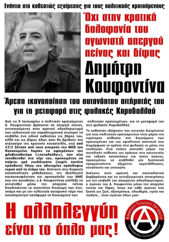 Desde el 8 de enero, el preso político D. Koufontinas está en huelga de hambre, resistiendo al totalitarismo estatal, que intenta vengativamente imponer un estado de excepción contra él y contra todxs lxs que son objetivo de la represión estatal. El 22 de febrero, pidió a lxs médicxs de la Unidad de Cuidados Intensivos del Hospital de Lamia que le quitaran los tubos del brazo que le hidrataban, ya que no podía beber agua, debido al agotamiento. En contra de las continuas operaciones represivas y de la intimidación ideológica y la propaganda de los medios de comunicación que las acompañan, D. Koufontinas optó por resistir iniciando una huelga de hambre, exigiendo su derecho indiscutible, concedido incluso por la última ley autoritaria que vulnera los derechos de lxs presxs políticxs, su traslado a la prisión de Korydallos.
