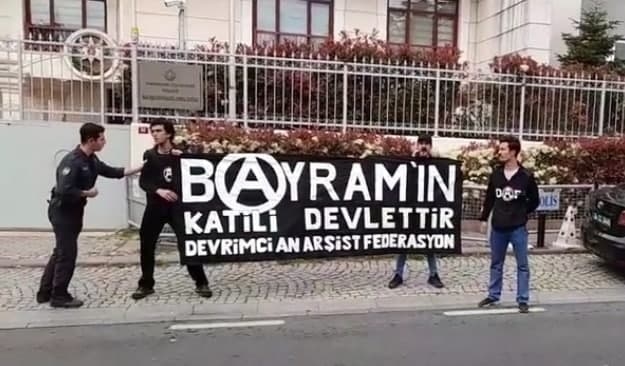 El anarquista Bayram Mammadov ha sido el objetivo del Estado azerbaiyano desde el primer día que se opuso a él. Fue torturado, calumniado, encarcelado y finalmente obligado a vivir como exiliado político. Ahora el Estado turco dice que Bayram se suicidó. Sabemos que mienten. Como escribimos en nuestra pancarta, el Estado asesinó a Bayram. Hoy hemos protestado frente al consulado de Azerbaiyán con nuestra pancarta para difundir la verdad a todo el mundo. No dejaremos de preguntar qué le pasó a Bayram.