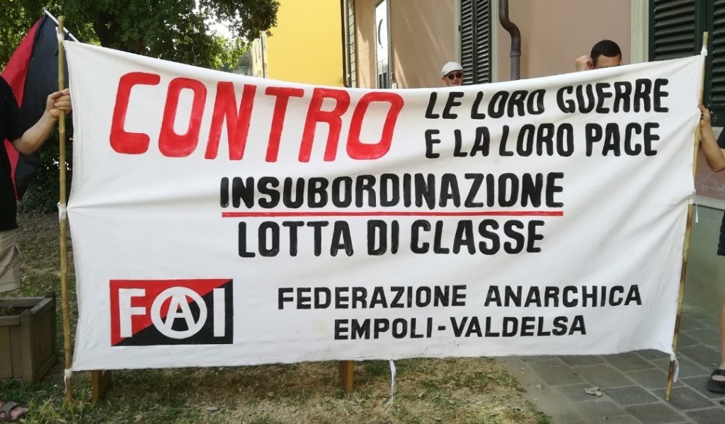 Éstas son nuestras posiciones, que confirman nuestro anti-militarismo en una perspectiva internacionalista y revolucionaria que debe arraigarse concretamente en las luchas sociales y en las redes de solidaridad, para crear salidas colectivas y libertarias del vórtice de la guerra al que nos arrojan los Estados y el capitalismo mundial. Ésta es nuestra contribución al debate internacional contra la guerra. Creemos que una cosa debe quedar clara por encima de todo: con o sin armas, para que sea efectiva, cualquier lucha debe hacerse y organizarse desde abajo, fuera de los aparatos de los estados, de los gobiernos y, especialmente, fuera de las fuerzas armadas.
