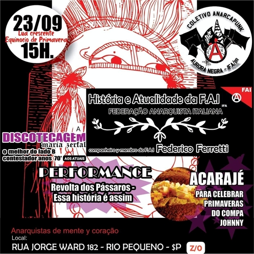 Contamos con la presencia de nuestro compañero Federico Ferretti, miembro de la F.A.I (Federación Anarquista Italiana), quien nos contó un poco sobre las historias de lucha y organización. Tuvimos DJ de nuestra hermana Maria Zerfal que nos trajo los mejores sonidos subversivos y underground desde los años 70 hasta la actualidad. Tuvimos una representación teatral con Mahu, además del delicioso acarajé hecho por sus manos. El museo Unusitado y sus compañerxs nos honraron con música de violín (con felicitaciones), rap en directo y un recital de poesía con Julio Guató y el apoyo de Teia dos Povos. Todo esto, con la cobertura del Núcleo Audiovisual Anarquista (NADA) grabando cada momento, además de una hermosa exposición, presentación/discurso/ritual indígena con lxs familiares Denilza Kaimbé, Joel Kariú Kariri y su hija. ¡Lxs niñxs siempre presentes! ¡Agradecemos a todxs por la celebración, a nuestra comunidad, colaboradorxs y colectivos, por hacer posible este evento! Así que menos, ¡hay más!