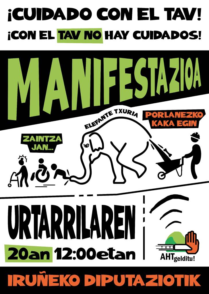 HONENGATIK ETA ASKOZ ERE GEHIAGORENGATIK, URTARRILAREN 20an ETOR ZAITEZ 12etan IRUÑEKO DIPUTAZIOTIK ABIATUKO DEN ABIADURA HANDIKO TRENA GELDITZEA ESKATZEKO MANIFESTAZIORA.