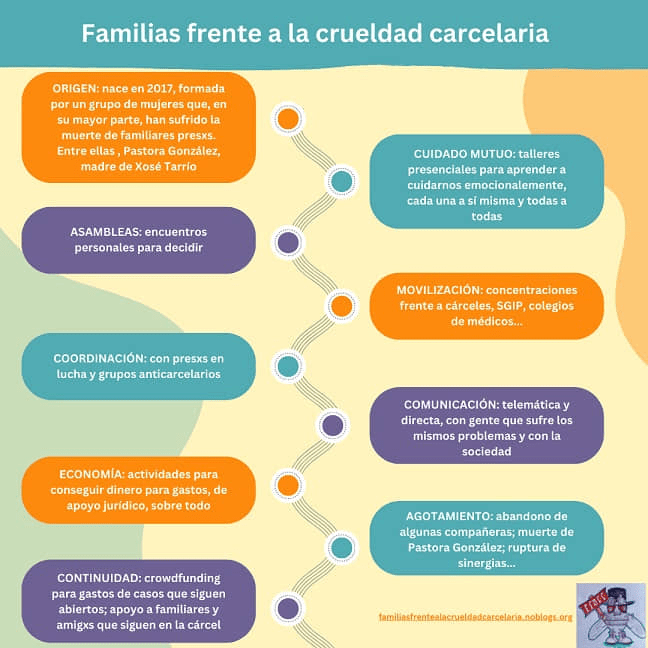 Para intentar enfrentarse a estas situaciones las familias deben hacer grandes esfuerzos, con gran impacto económico, psicológico y social, en su salud y en su vida, como si, no habiendo hecho nada, tuvieran que sufrir también una condena. Nuestra asociación la formaron en 2017 un grupo de mujeres que tenían familiares presos o los habían perdido: sus hijos, hermanos o compañeros habían muerto estando en prisión. Entre ellas, Pastora González, la madre de Xosé Tarrío, que fue para nosotras una compañera importante por su contagiosa energía y gran corazón. Empezamos con mucho ímpetu. El apoyo y el cuidado recíproco entre nosotras era nuestra principal fuente de energía. Con ayuda de una psicoterapeuta, hicimos varios talleres en los que aprender a articularlo. Encuentros personales, directos, entre nosotras, que aprovechábamos también para hacer asambleas y tomar decisiones.